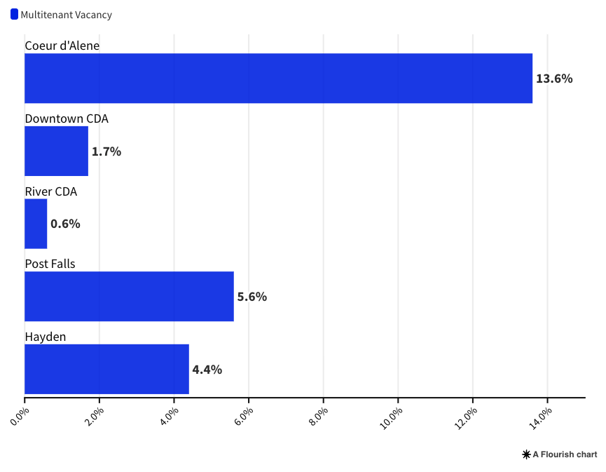 Retail lease rates have held steady at $22.00 per square foot (NNN, Annual) since the start of the year with the highest rates seen in Post Falls, averaging $24.00 per square foot. Overall vacancy ended August at the lowest level this year, 1.6 percent.
