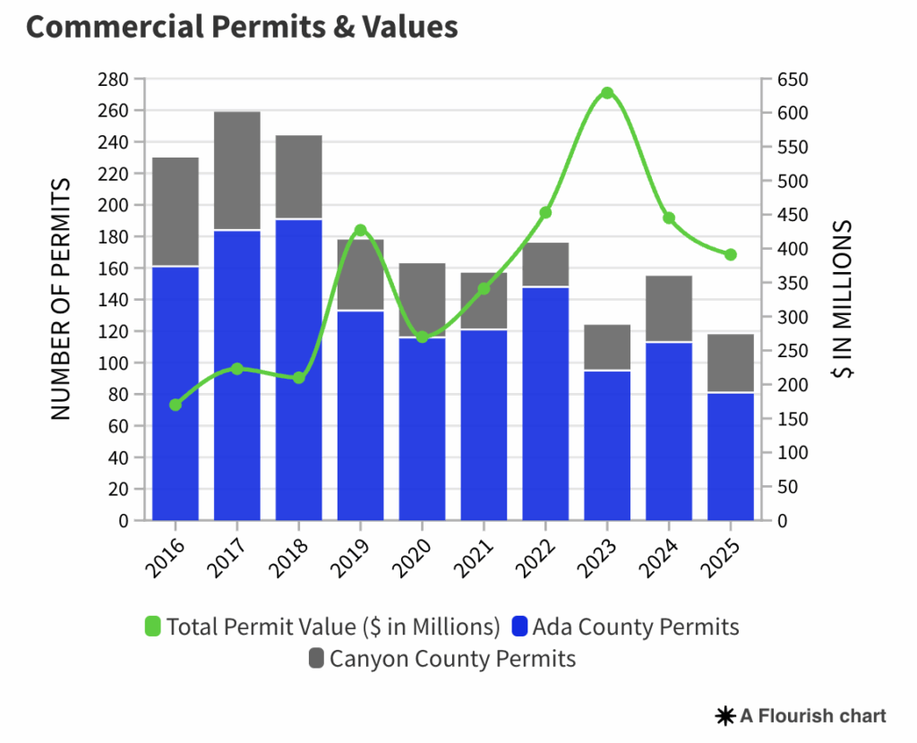 The total number of commercial permits increased nearly 17 percent to 118 permits, with values jumping over 24 percent to $391 million through July 2025. Notably, 45 percent of this permit value is attributed to construction activity at Micron, highlighting the semiconductor manufacturer’s significant impact on the region’s commercial development. In addition, Canyon County continues its growth trajectory with commercial permits up 32 percent year-over-year. Permit value increased by over 24% compared to the end of July 2024.